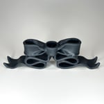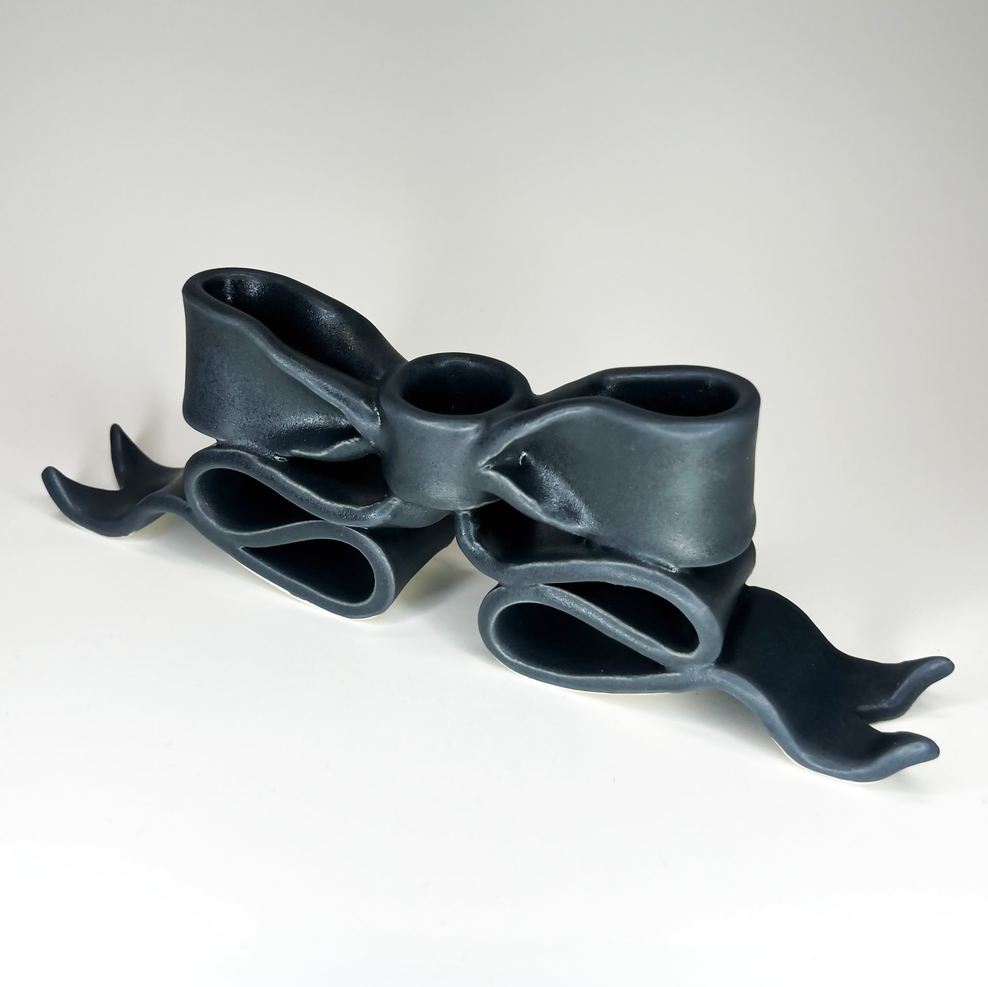 A hand-built porcelain candleholder shaped like an oversized flowing bow, glazed in a deep satin grey.