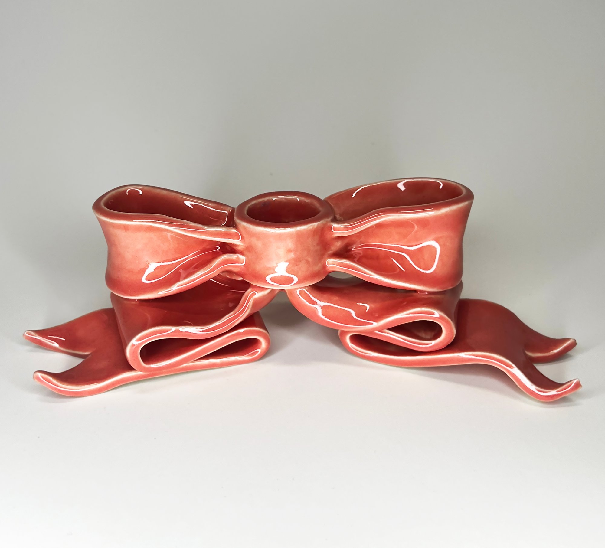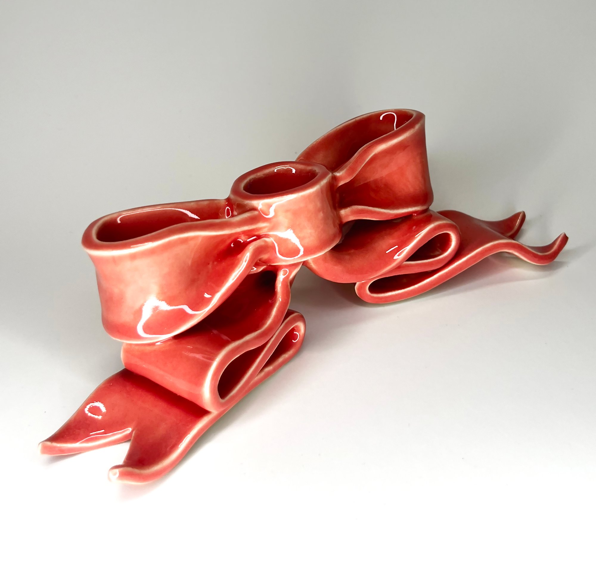 A hand-built porcelain candleholder shaped like an oversized flowing bow, glazed in a pink gloss.